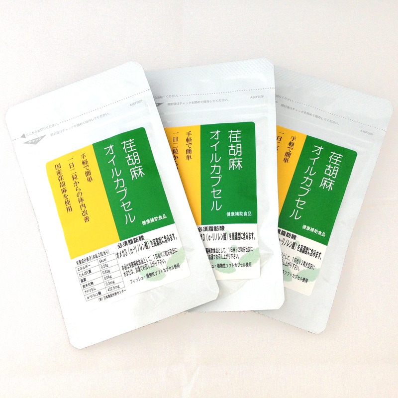 『荏胡麻オイルカプセル』は栄養補助食品です。普段の食事では不足しがちなオメガ3を手軽に補えます。