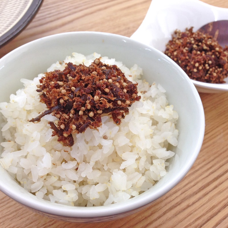 白いごはんに乗せると、まずはふわっと香る醤油の香ばしさ。口に含むと、えごまのぷちぷちとした食感、おかかの濃厚な旨み、昆布のまろやかな甘みがたまらない逸品。